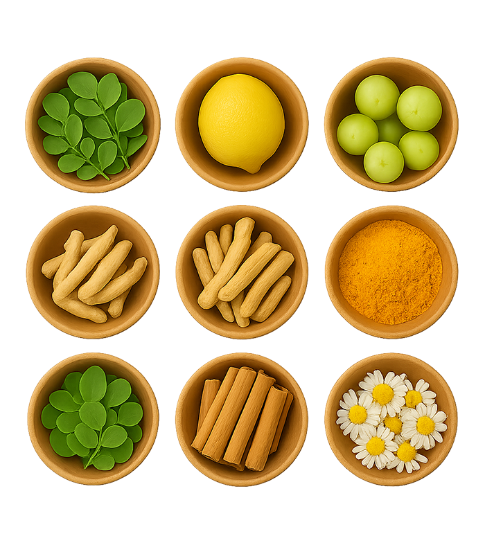 Blended with ashwagandha, moringa, amla, turmeric, cinnamon, ginger, chamomile, and lemon peel — this adaptogenic mix fuels energy, strengthens immunity, balances stress, and restores your natural glow from within.